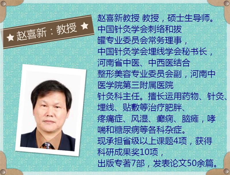 趙喜新教授 教授,碩士生導師。中國針灸學會刺絡和拔罐專業(yè)委員會常務理事,中國針灸學會埋線學會秘書長,河南省中醫(yī)、中西醫(yī)結合整形美容專業(yè)委員會副,河南中醫(yī)學院第三附屬醫(yī)院針灸科主任。擅長運用藥物、針灸、埋線、貼敷等治療肥胖、疼痛癥、風濕、腦癱,哮喘和糖尿病等各科雜癥。現(xiàn)承擔省級以上課題4項,獲得科研成果獎10項,出版專著7部,發(fā)表論文50余篇。