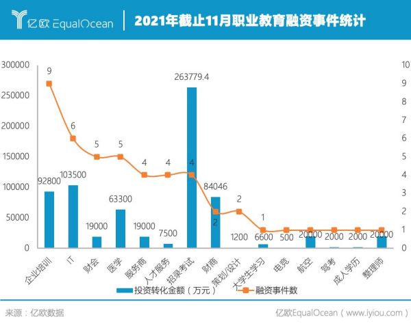 除了政策利好,職業(yè)教育亦受到資本青睞。截止11月,2021年已有云學堂、UMU互動學習平臺、課觀教育、三節(jié)課等多家職業(yè)教育相關企業(yè)獲得多輪融資,融資事件累計達56次,并迎來了傳智教育、職業(yè)教育兩家職業(yè)教育企業(yè)的上市,覆蓋職業(yè)教育中服務提供商和學習咨詢平臺。 根據億歐智庫數據顯示,2021年截止11月,職業(yè)教育融資事件中,A輪融資和并購項目數量最多超過行業(yè)整體的三分之一,而從細分的投資方向來看,企業(yè)培訓類企業(yè)在今年的融資較多,IT、招錄考試、財商和醫(yī)學類賽道也是資本市場較為活躍和關注的領域。