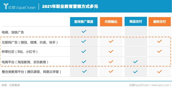 以就業(yè)為導向的人才適應性提升 職業(yè)教育作為以就業(yè)為導向的教育方式,其適應性不僅只體現在人才培養(yǎng)上,還在于人才的管理和服務。 在人才培養(yǎng)的學歷階段,職業(yè)院校是主要的培養(yǎng)方,2021年10月中共中央辦公廳、國務院辦公廳印發(fā)《關于推動現代職業(yè)教育高質量發(fā)展的意見》就加快構建現代職業(yè)教育體系做出進一步的部署。人才適應能力的提升一方面來自于職業(yè)教育體系和普通教育體系的橫向融通和縱向貫通,打通升學渠道,另一方面則是面向市場,以企業(yè)崗位需求為目標,通過綜合的育人機制,改善職業(yè)教育學歷階段的人才供給結構。 企業(yè)則是通過校企合作和自主培養(yǎng),輸出資金、技術、實踐案例,吸納專業(yè)人才,強化品牌認知。 隨著靈活用工方式的出現從人員招聘、用工管理到員工技能培訓、權益保障都有對應的服務提供,人與崗位,人才與企業(yè)之間匹配的靈活性增加、時效性增強,帶來了人才服務效率的整體提升。 在線化職業(yè)教育服務交付 在線化服務交付,顧名思義,教育的在線化是社會經濟高質量飛躍、互聯網等技術成熟發(fā)展的必然結果,在不斷提高的互聯網普及率和新冠疫情的沖擊下,職業(yè)教育的全面在線化為行業(yè)升級的新成果。而招生營銷和教學形式的全面升級是職業(yè)教育在線化后表現最為突出的兩方面。