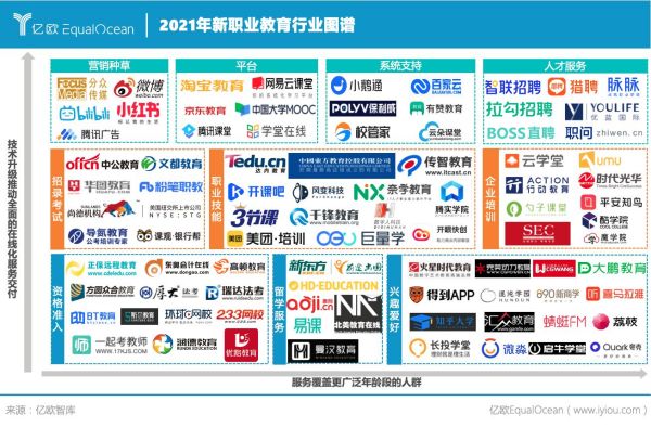 毫無疑問,新職業(yè)教育正迎來新的風口。 2021年職業(yè)教育政策頻發(fā),這既是職業(yè)教育改革的進一步推進,亦是新的社會經濟環(huán)境使然。 隨著社會經濟、技術的高速發(fā)展和社會分工的精細化,在更多行業(yè)縱向深入發(fā)展的同時催生了很多新行業(yè),新職業(yè)、新崗位應運而生,以就業(yè)為導向的職業(yè)教育也成為越來越多職場人的核心需求。 與傳統(tǒng)職業(yè)教育不同的是,新職業(yè)教育在新的時代背景下呈現出三方面的變化:在教學內容上,已經從提升職場硬實力延伸為泛職業(yè)軟技能的培訓,除了工作技能的提升還包括興趣愛好等具有社交功能的培訓;在教學形式上,直播、短視頻等新技術加入使得優(yōu)質內容的傳播更加高效,基于教學空間的延伸,優(yōu)質教學內容能覆蓋更多的學習者;在目標人群上,隨著退休年齡的延長,新職業(yè)教育也逐步覆蓋到16-60歲更為廣泛的職場人群。 億歐智庫發(fā)布《2021新職業(yè)教育行業(yè)發(fā)展研究報告》,報告旨在呈現職業(yè)教育在如今發(fā)展環(huán)境下的發(fā)展新形態(tài),并探析新職業(yè)教育的未來趨勢和發(fā)展前景,為更多謀求職業(yè)精細規(guī)劃的泛職場人群明晰新職業(yè)教育發(fā)展的動向和趨勢。
