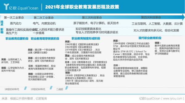 第一次工業(yè)革命后,以學徒制為主的職業(yè)教育萌芽出現,主要以英國、德國職業(yè)教育體系為代表;二戰(zhàn)后,各國產業(yè)結構呈現多元豐富的發(fā)展趨勢,職業(yè)教育逐步實現制度化、體系化發(fā)展,英美日德各自頒布職業(yè)教育相關法律促進職業(yè)教育規(guī)范化發(fā)展;信息化時代來臨,信息網絡數字化為主的職業(yè)教育培訓迎來新的發(fā)展期。