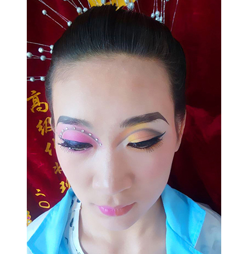 在顴骨處以打圈的方式刷上深色腮紅,腮紅要逐漸暈開,與粉底自然融合。沿耳朵前方至下頜角的方向來回刷上稍淺的腮紅,顏色逐漸減淡過渡到下頜,并充分揉開。