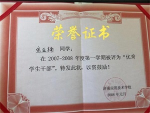 2007年-2008年被評為“優(yōu)秀學生干部”