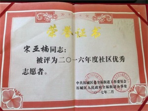 2017年2月被評為社區(qū)優(yōu)秀志愿者。