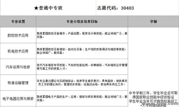 普通中專:數(shù)控技術應用、模具制造技術、機電設備安裝與維修(電梯安裝與維修)、機電技術應用、電子電器應用與維修、國際商務、計算機及應用。