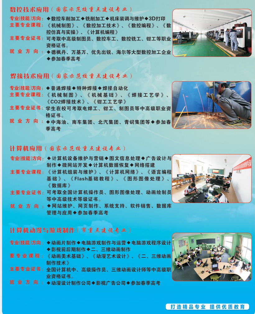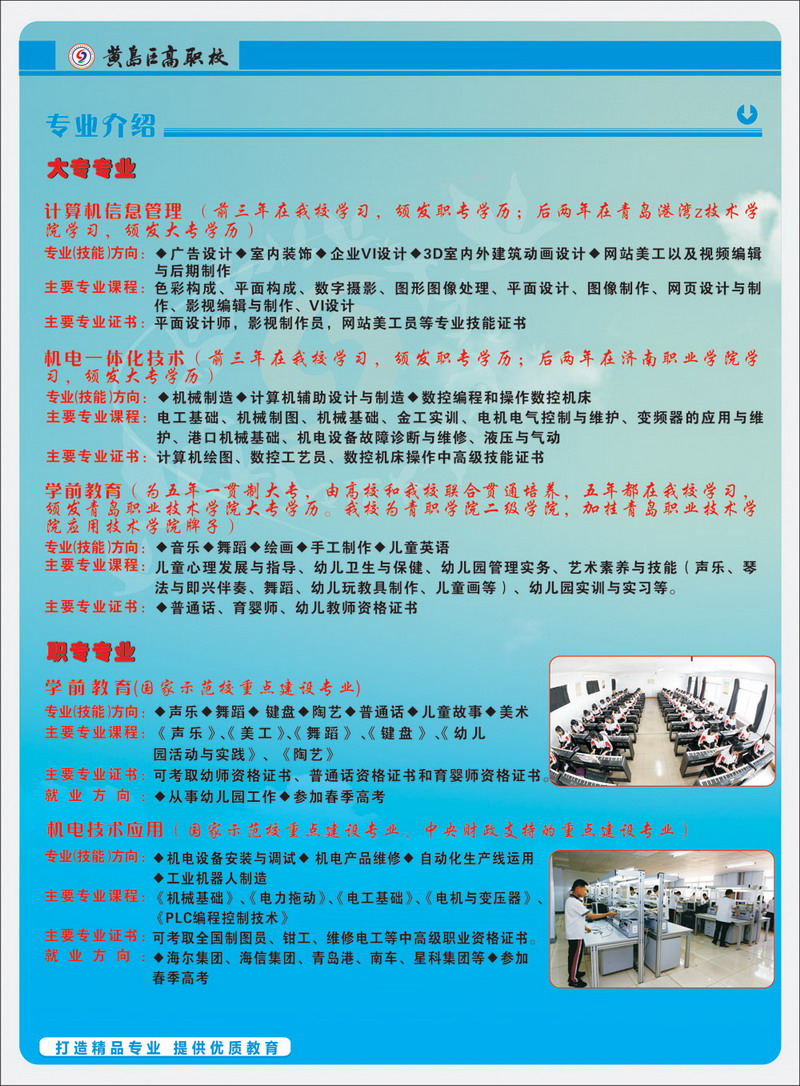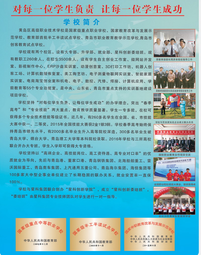 青島黃島區(qū)高級(jí)職業(yè)技術(shù)學(xué)校(原膠南市現(xiàn)合并為青島市黃島區(qū))是國(guó)家級(jí)重點(diǎn)職業(yè)學(xué)校、國(guó)家教育改革與發(fā)展示范學(xué)校、教育部首批半工半讀試點(diǎn)學(xué)校、青島市職業(yè)教育教學(xué)示范學(xué)校。 學(xué)校現(xiàn)有兩個(gè)校區(qū),設(shè)有“3+2”和“2+3”大專部、升學(xué)部、就業(yè)部、工學(xué)部,在校生4500人。建有機(jī)電、電子、數(shù)控、焊接、汽車維修、計(jì)算機(jī)應(yīng)用、學(xué)前教育等55個(gè)專業(yè)功能室,是中央、山東省、青島市重點(diǎn)支持的實(shí)訓(xùn)基地建設(shè)項(xiàng)目學(xué)校。 學(xué)?,F(xiàn)有教職工260多人,市級(jí)以上優(yōu)秀教師、教學(xué)能手、骨干教師、優(yōu)秀專業(yè)人才等80多人。學(xué)校實(shí)行“訂單式辦學(xué),軍事化管理,開放式教學(xué)”,教育教學(xué)質(zhì)量顯著。學(xué)生在???.