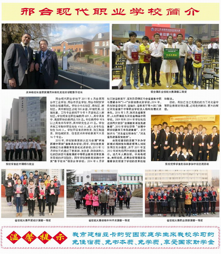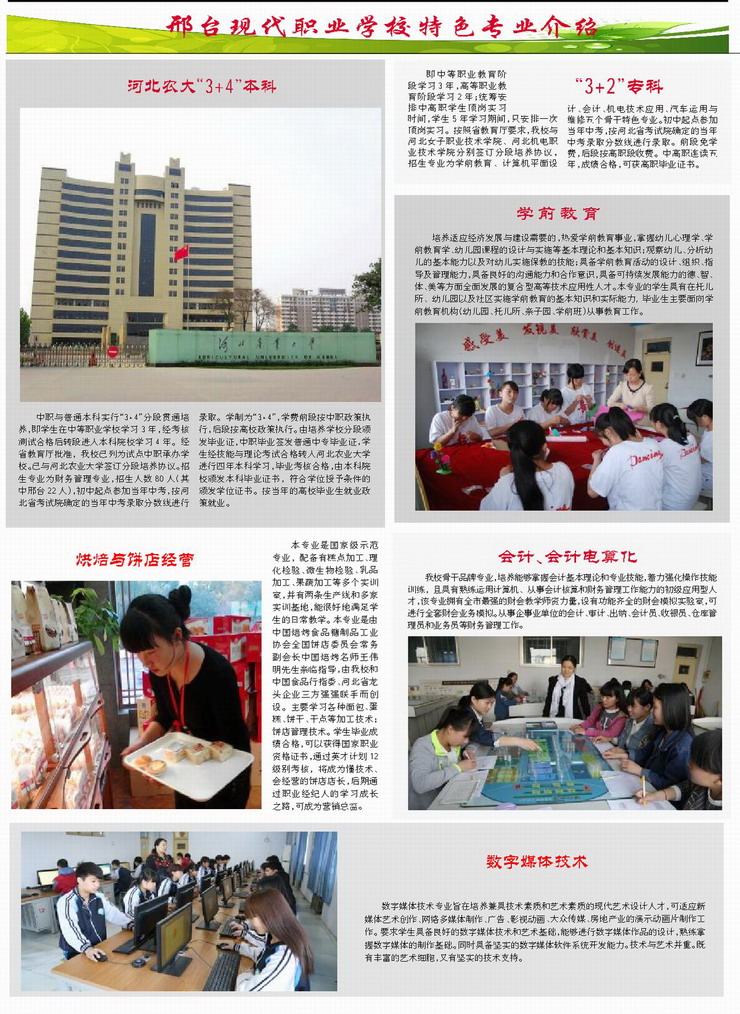相關學校推薦: 冀中工程技師學院招生簡章 邯鄲工程高級技工學校招生簡章 邯鄲經(jīng)濟管理中等專業(yè)學校招生簡章 邯鄲華博中等專業(yè)學校招生簡章 ☆全國教育系統(tǒng)先進集體 ☆全國德育工作先進集體 ☆首批國家中等職業(yè)教育改革發(fā)展示范校 ☆河北省首批中職與普通本科“3+4”分段培養(yǎng)試點學校 ☆全國教育信息化試點學校 邢臺現(xiàn)代職業(yè)學校簡介: 邢臺現(xiàn)代職業(yè)學校于2011年6月由原邢臺市工業(yè)學校、邢臺市農(nóng)業(yè)學校、邢臺市財貿(mào)學校聯(lián)合組建而成的一所國辦中職學校。學校分為北校區(qū)、新校區(qū)。其中新校區(qū)占地500余畝,環(huán)境優(yōu)美,設施完善,工科專業(yè)部、農(nóng)科專業(yè)部和學前教育部先后遷入新校區(qū)。 ..