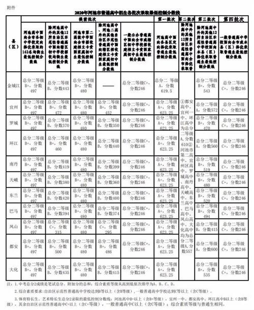 河池市教育局關(guān)于公布2020年河池市普通高中招生錄取最低控制分數(shù)線的通知 各縣(區(qū))教育局,市直各普通高中學校: 根據(jù) 2020年全市普通高中招生計劃、