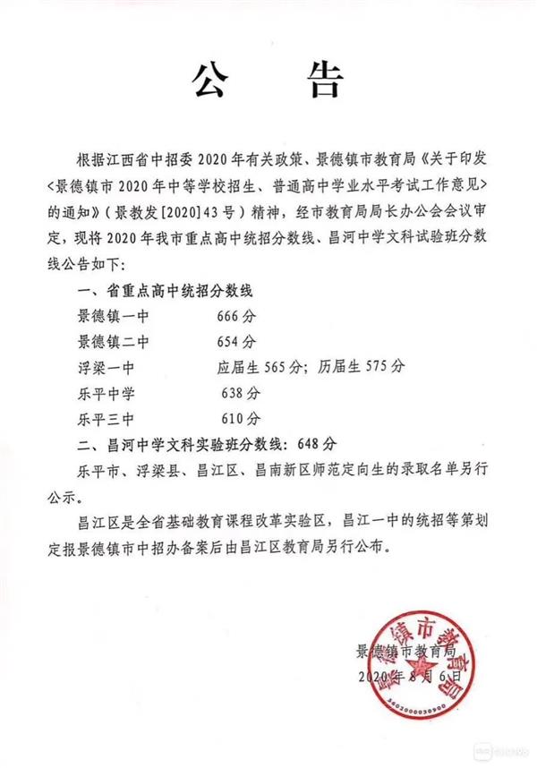 2020年江西景德鎮(zhèn)中考重點高中統(tǒng)招分數(shù)線公布