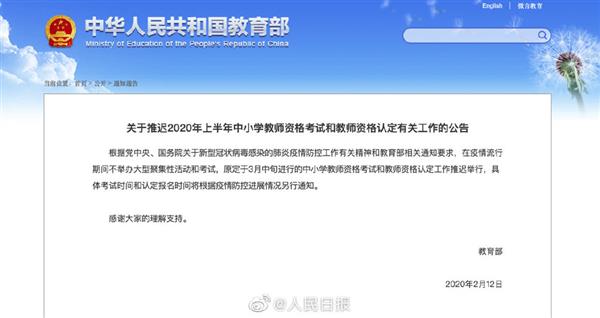 教育部:推遲中小學(xué)教師資格考試和認(rèn)定 教育部消息,原定于3月中旬進(jìn)行的中小學(xué)教師資格考試和教師資格認(rèn)定工作推遲舉行,具體考試時(shí)間和認(rèn)定報(bào)名時(shí)間