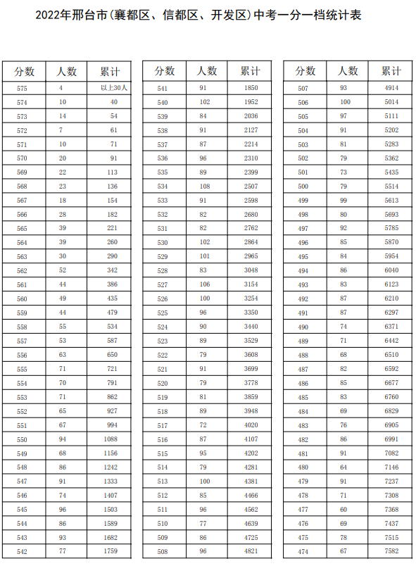 河北邢臺中考成績一分一檔公布 2022年邢臺市 (襄都區(qū)、信都區(qū)、開發(fā)區(qū)) 中考成績一分一檔表 中考考分數(shù)在550分及以上考生數(shù)量為1088人
