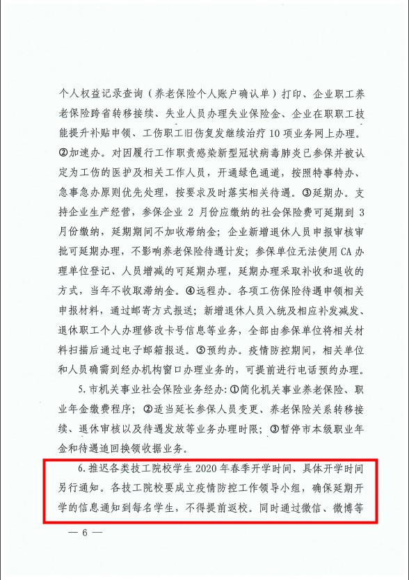 推遲各類技工院校學(xué)生2020年春季開學(xué)時間,具體開學(xué)時間另行通知。各技工院校要成立疫情防控工作領(lǐng)導(dǎo)小組,確保延期開學(xué)的信息通知到每名學(xué)生,不得提前返校。同時通過微信、微博等各種網(wǎng)絡(luò)渠道進(jìn)行假期生活提示,開展健康教育,做好防護(hù)引導(dǎo)。
