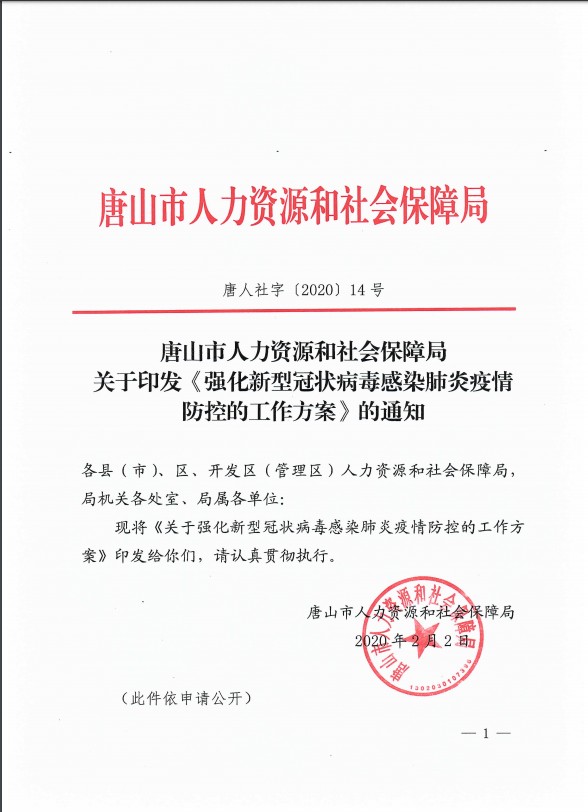 唐山市人社局關(guān)于印發(fā)《強(qiáng)化新型冠狀病毒感染的肺炎疫情防控的工作方案》的通知