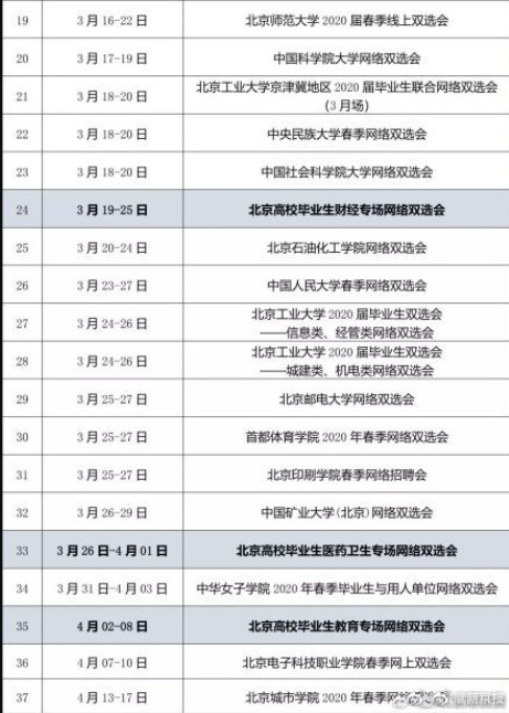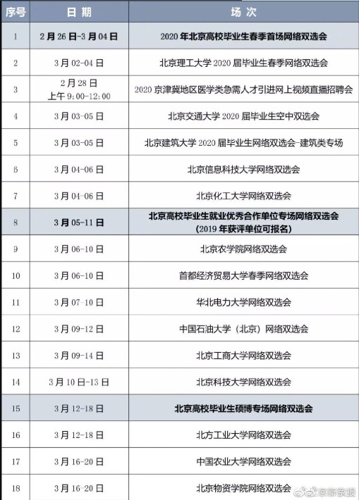 自2020年2月26日起,不同主題的網(wǎng)絡(luò)雙選會將陸續(xù)舉辦,每場雙選會持續(xù)時間為3-7天。
