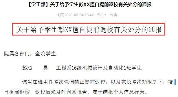 這2名學(xué)生在確認(rèn)收到學(xué)校不得提前返校的通知后,仍然不顧省教育廳《關(guān)于2020年全省春季學(xué)期延期開(kāi)學(xué)的通知》所明確的“所有學(xué)生不得提前返?!钡囊?,以及學(xué)校相關(guān)管理規(guī)定,不聽(tīng)勸阻,在當(dāng)前嚴(yán)峻的疫情防控形勢(shì)下,擅自提前返校。
